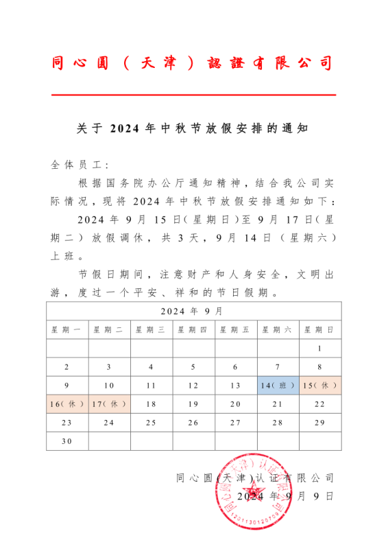 2024年中秋节放假通知