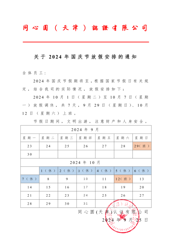 2024年国庆节放假通知