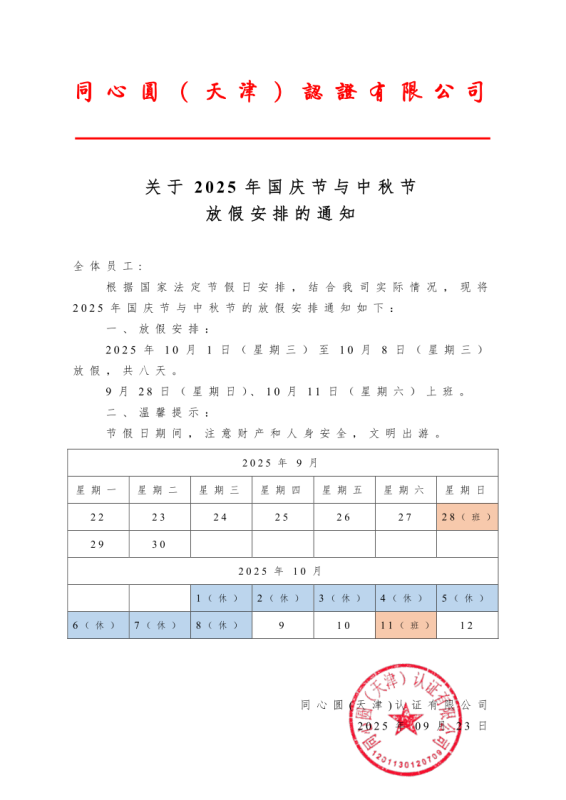 2025年国庆节和中秋节放假通知