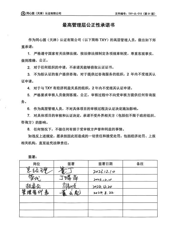 认证规则制定和实施承诺书