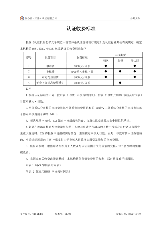 TXY-GK-04_01.00 认证收费标准